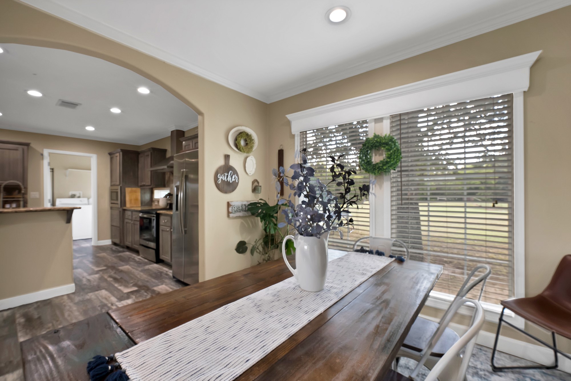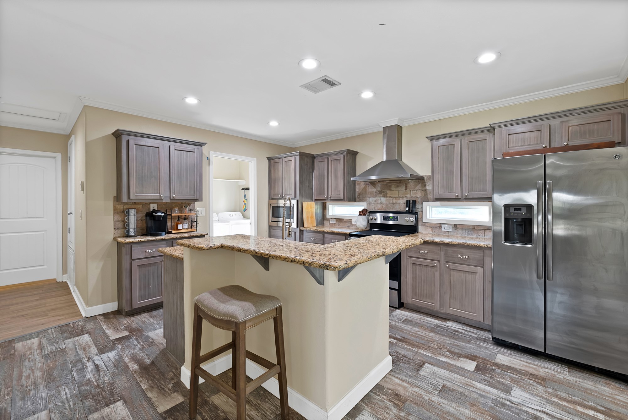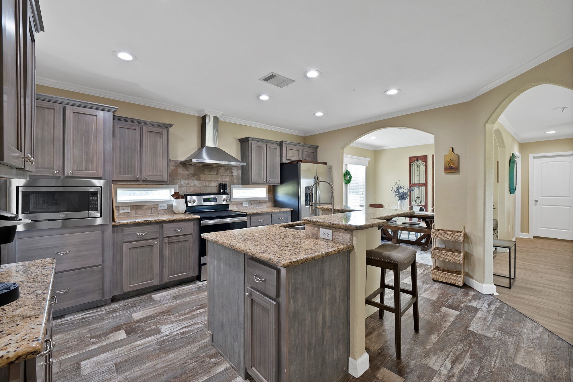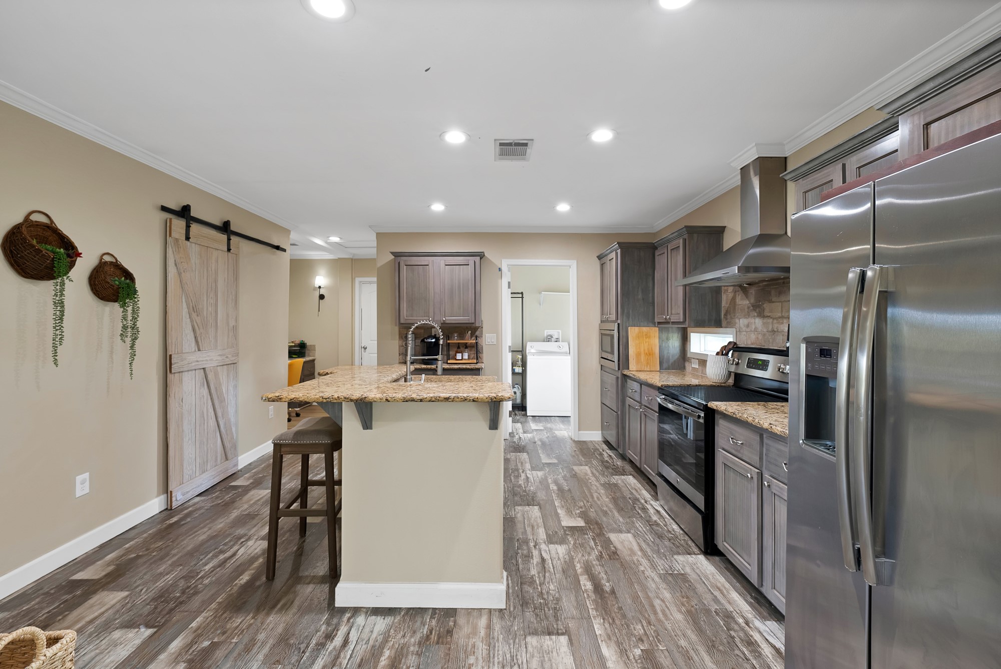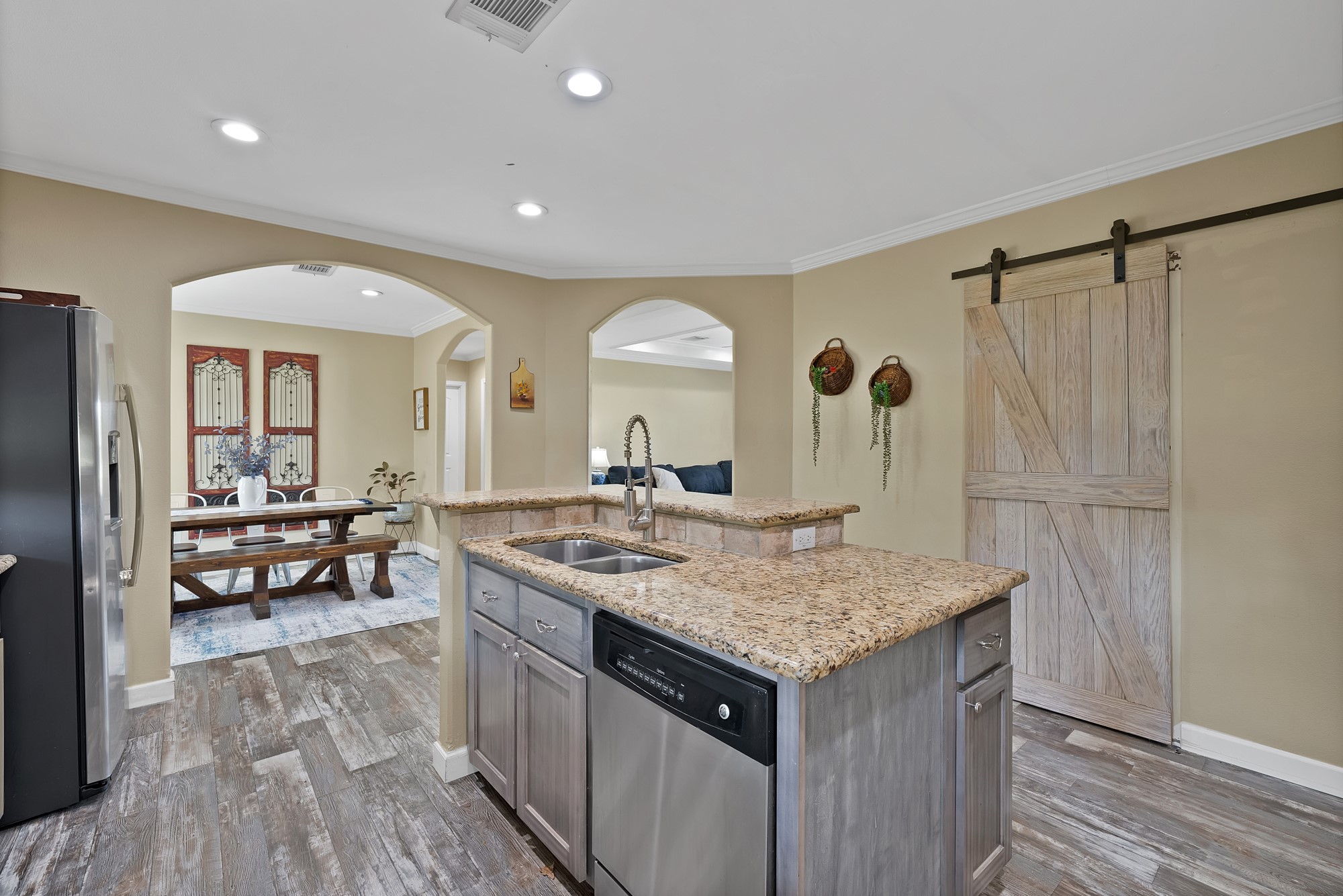 Inside, the spacious kitchen shines with granite countertops, a breakfast-bar seating, and a charming sliding barn door that opens to the large walk-in pantry. The open living and dining areas make gatherings easy, while the primary suite features a spa-like bath with dual vanities, an oversized shower, and a generous walk-in closet. Fresh paint, new flooring, and recessed lighting throughout bring a clean, updated feel while maintaining the inviting character of the home.