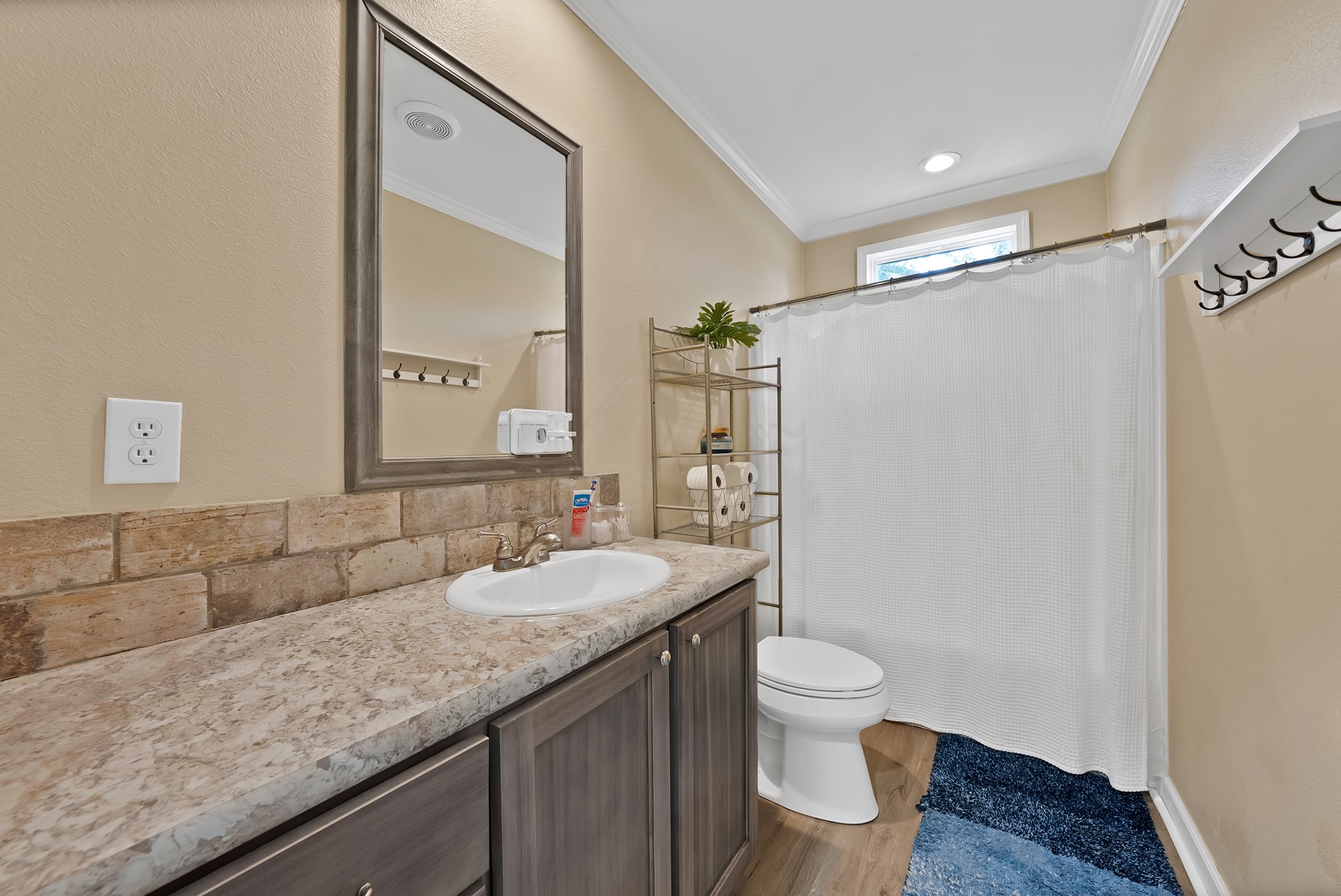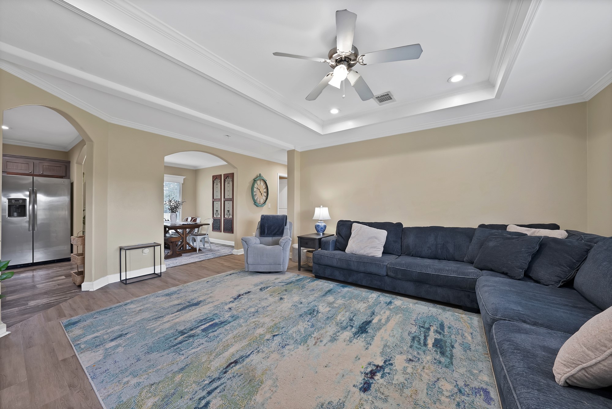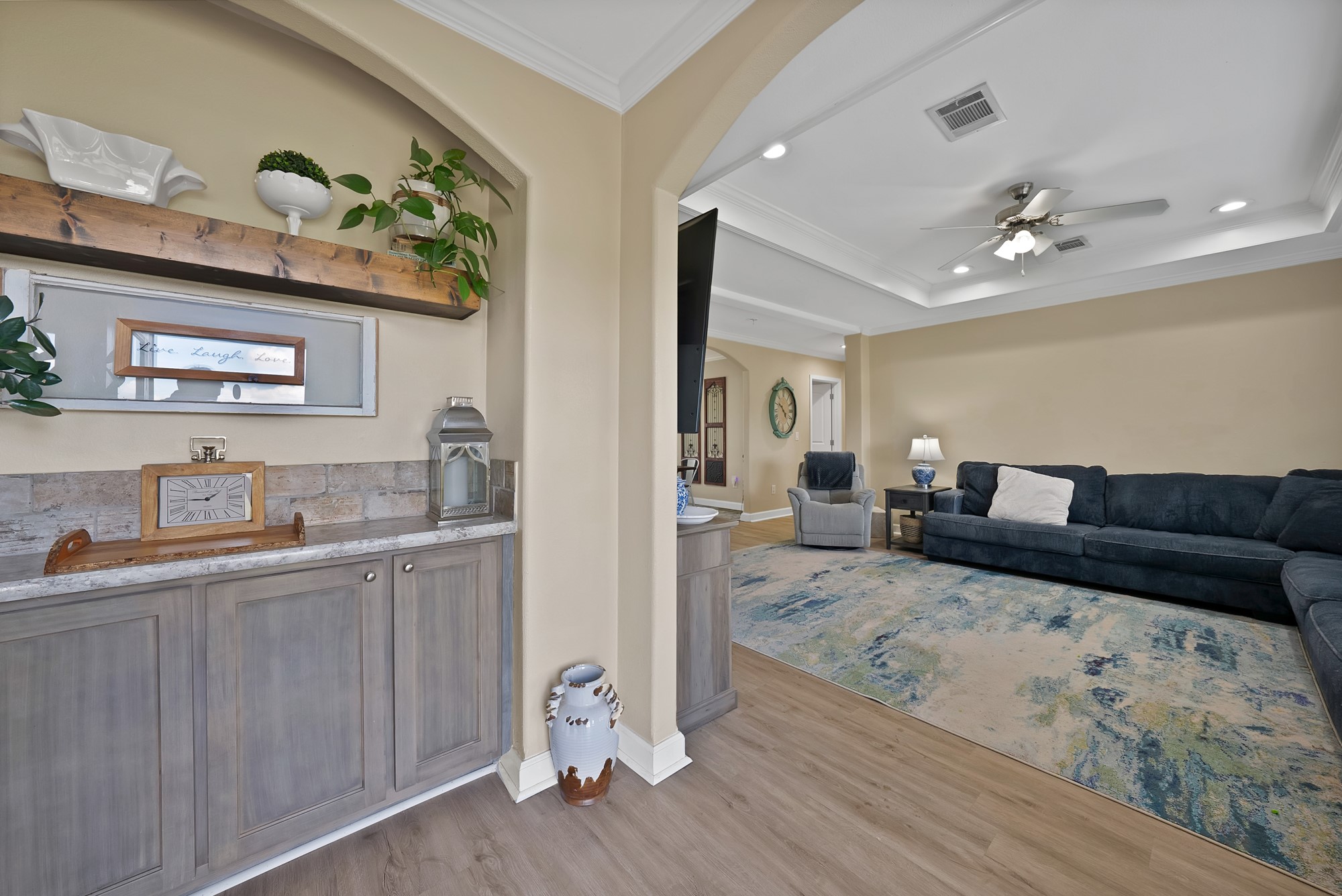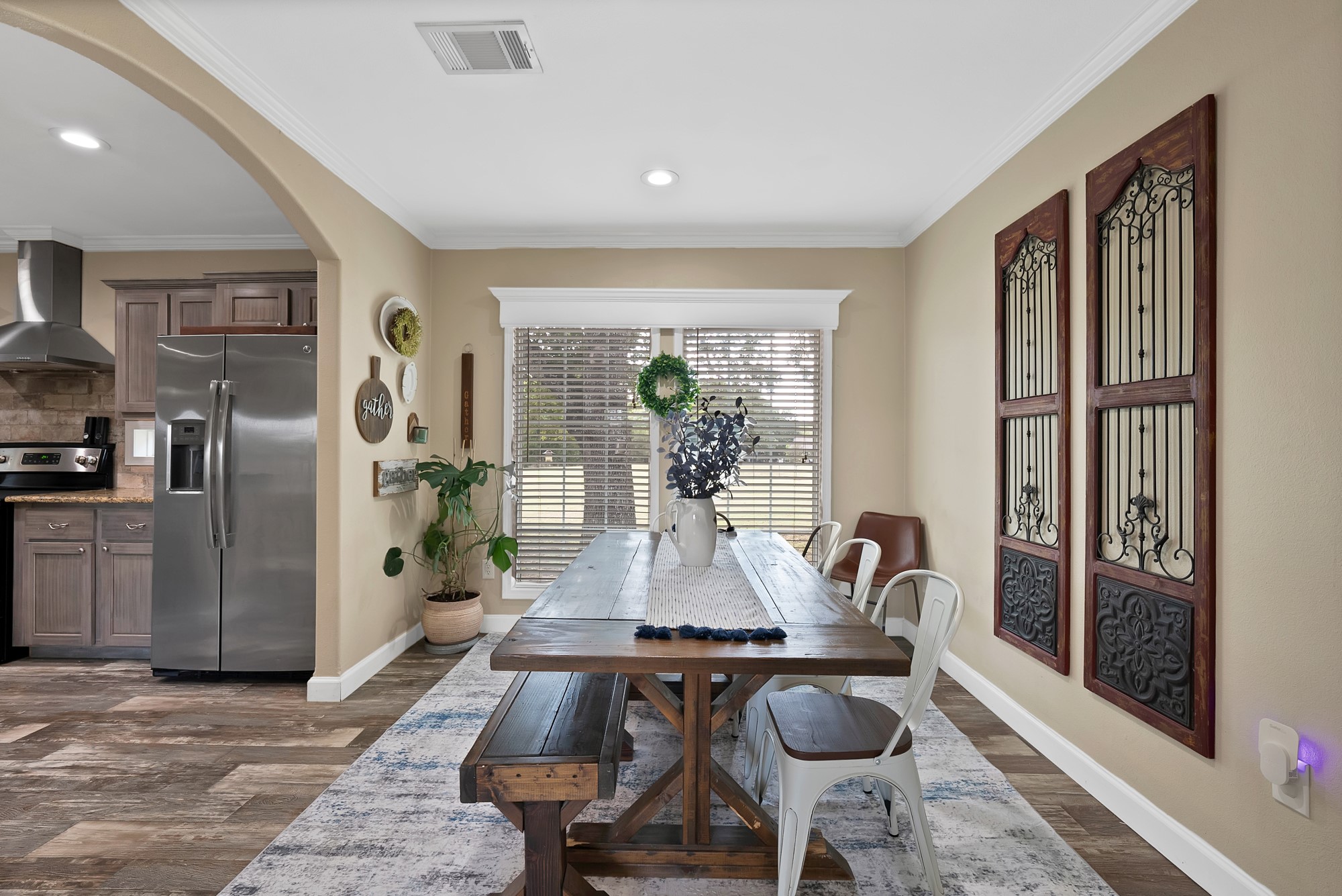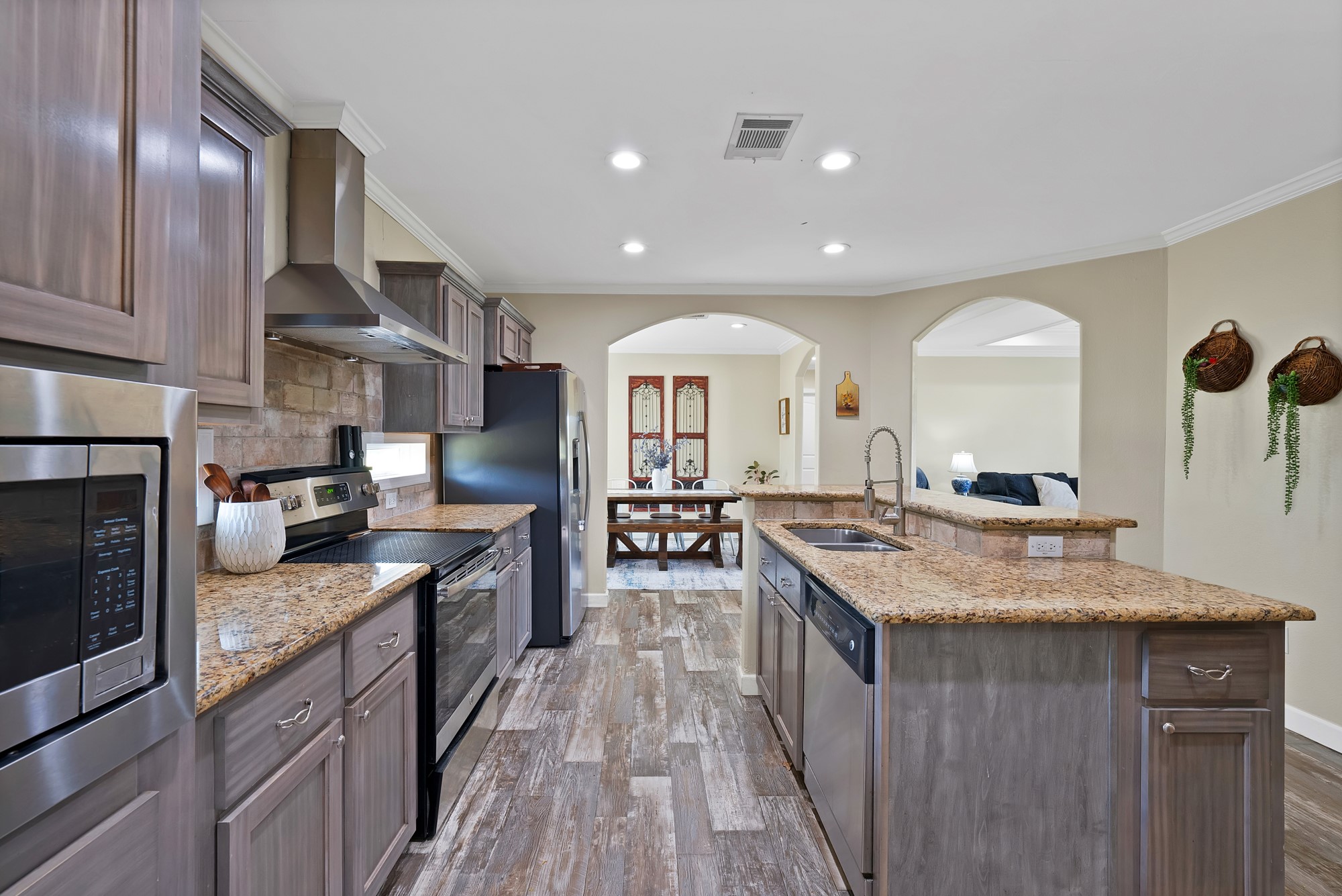 Inside, the spacious kitchen shines with granite countertops, a breakfast-bar seating, and a charming sliding barn door that opens to the large walk-in pantry. The open living and dining areas make gatherings easy, while the primary suite features a spa-like bath with dual vanities, an oversized shower, and a generous walk-in closet. Fresh paint, new flooring, and recessed lighting throughout bring a clean, updated feel while maintaining the inviting character of the home.