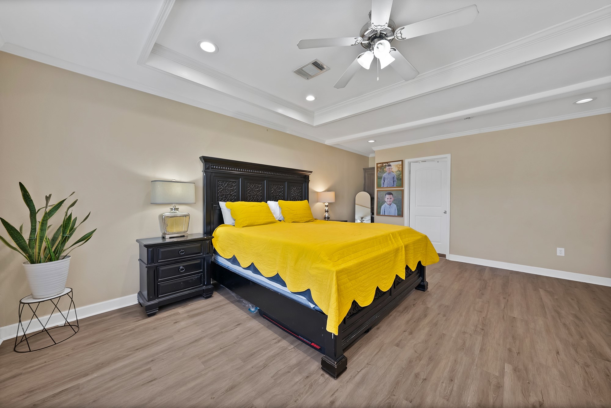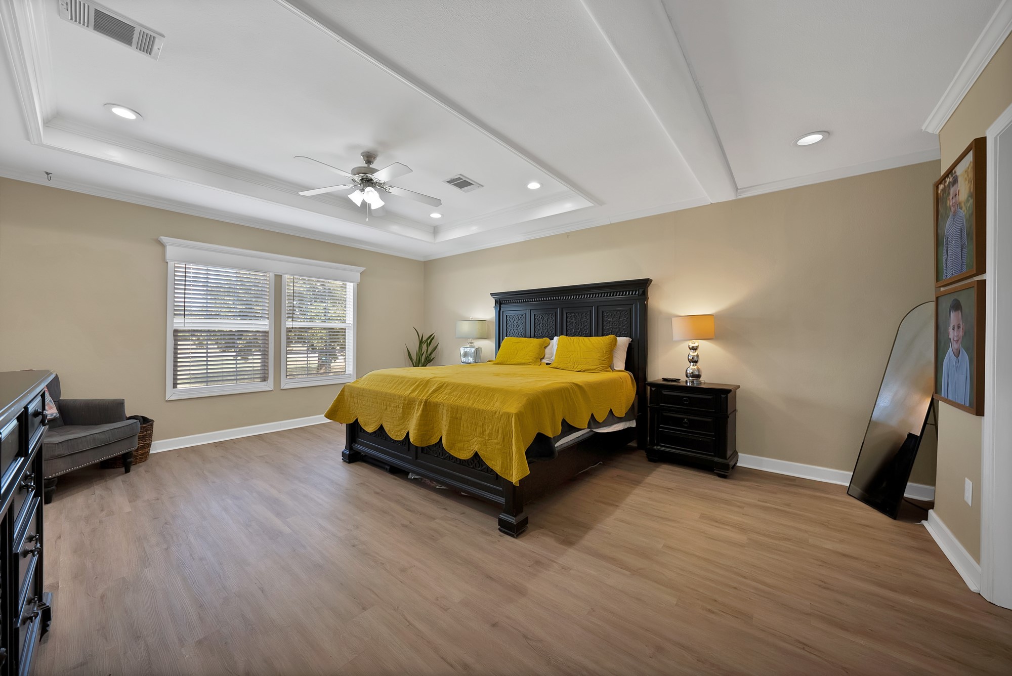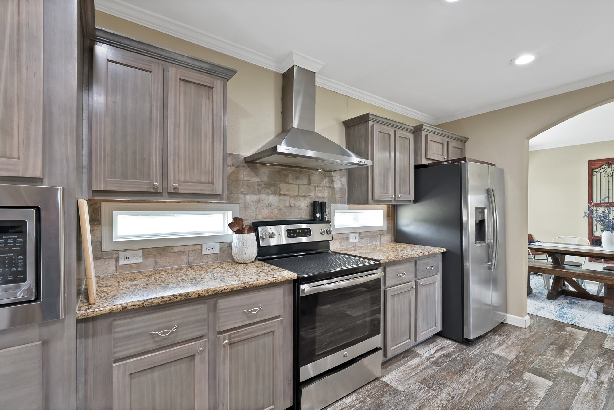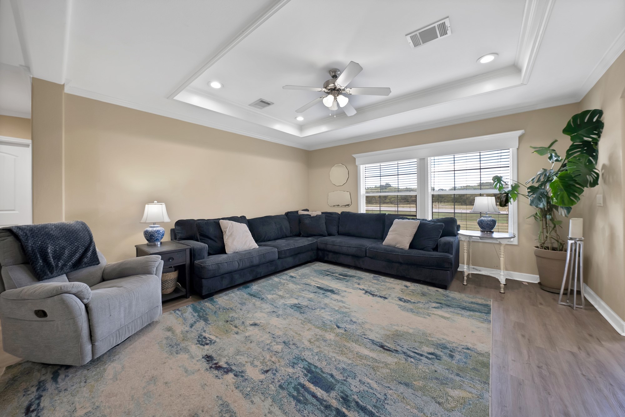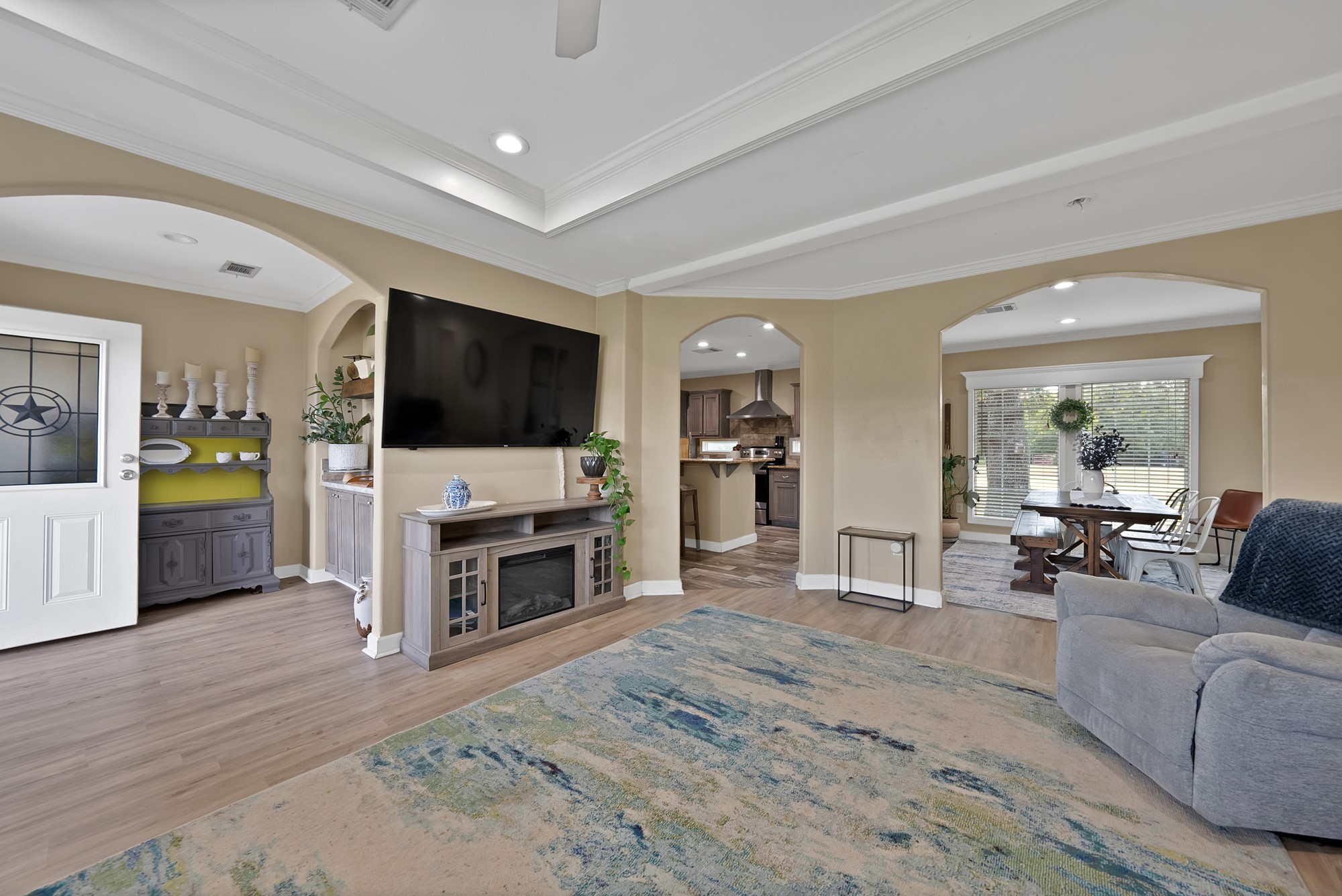 Inside, the spacious kitchen shines with granite countertops, a breakfast-bar seating, and a charming sliding barn door that opens to the large walk-in pantry. The open living and dining areas make gatherings easy, while the primary suite features a spa-like bath with dual vanities, an oversized shower, and a generous walk-in closet. Fresh paint, new flooring, and recessed lighting throughout bring a clean, updated feel while maintaining the inviting character of the home.