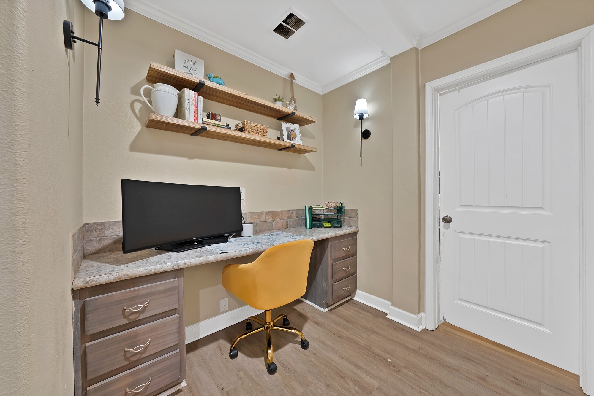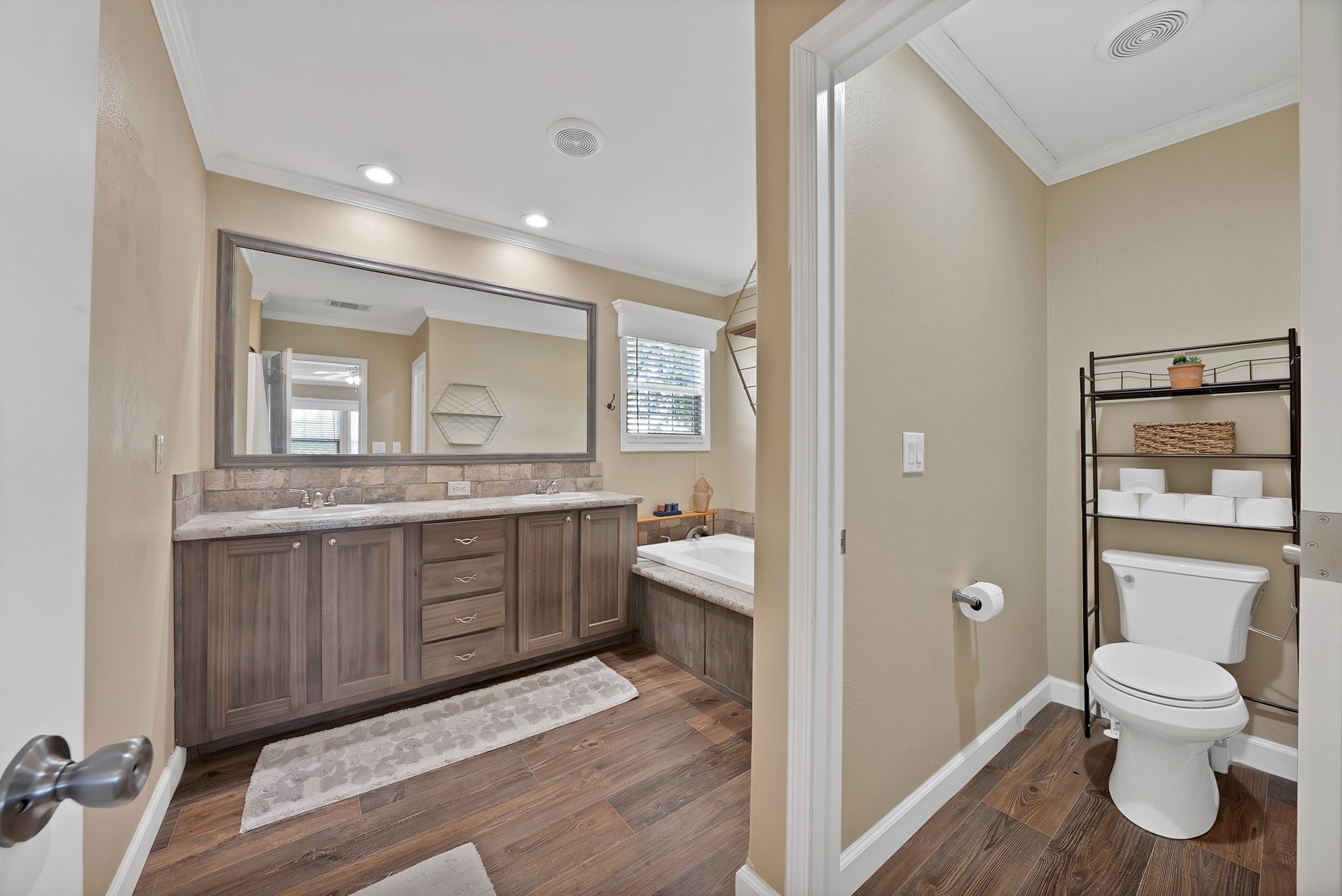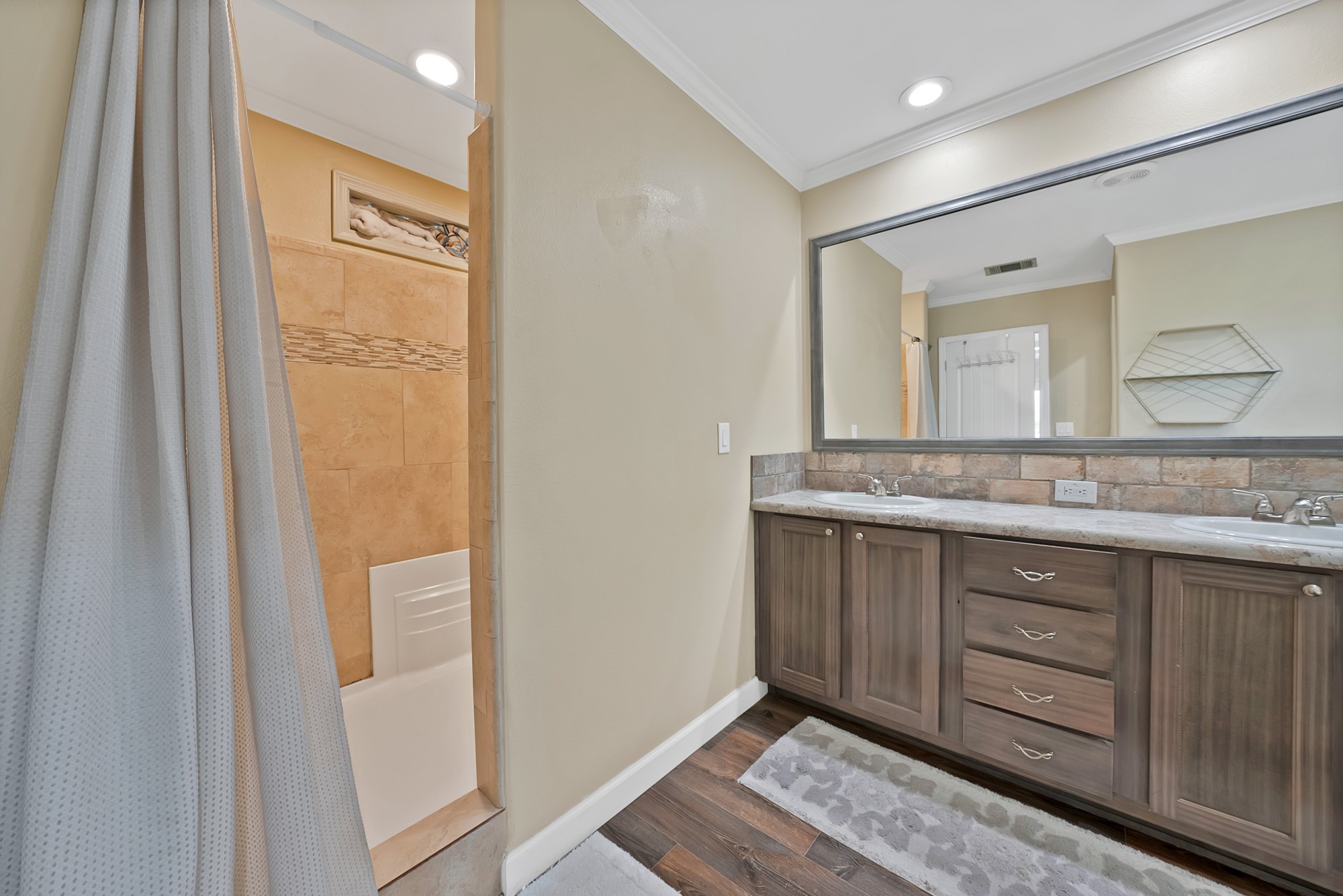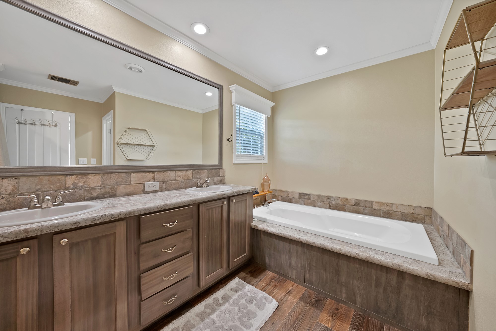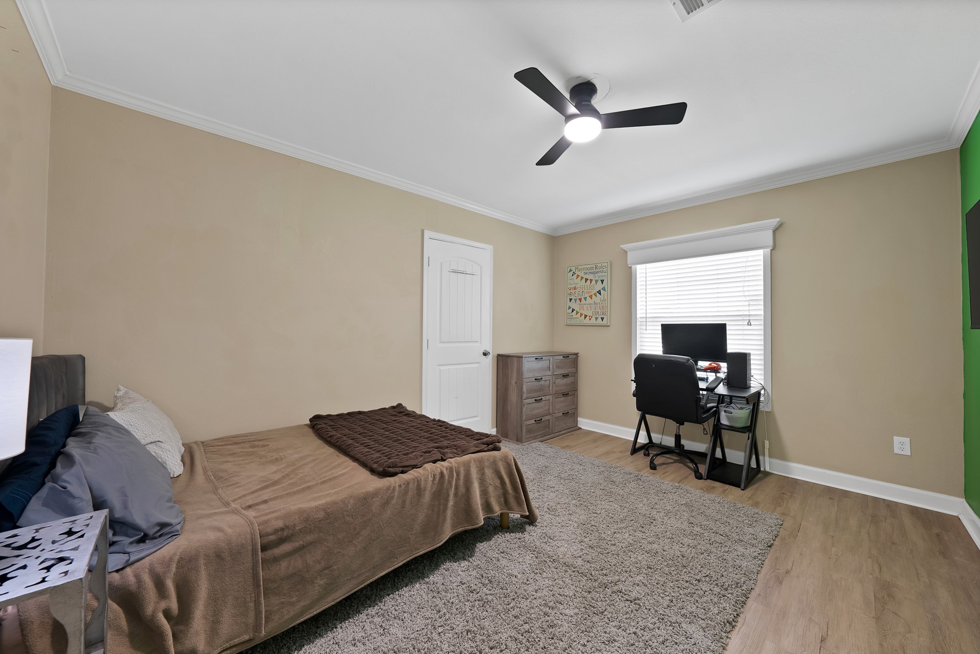 Inside, the spacious kitchen shines with granite countertops, a breakfast-bar seating, and a charming sliding barn door that opens to the large walk-in pantry. The open living and dining areas make gatherings easy, while the primary suite features a spa-like bath with dual vanities, an oversized shower, and a generous walk-in closet. Fresh paint, new flooring, and recessed lighting throughout bring a clean, updated feel while maintaining the inviting character of the home.