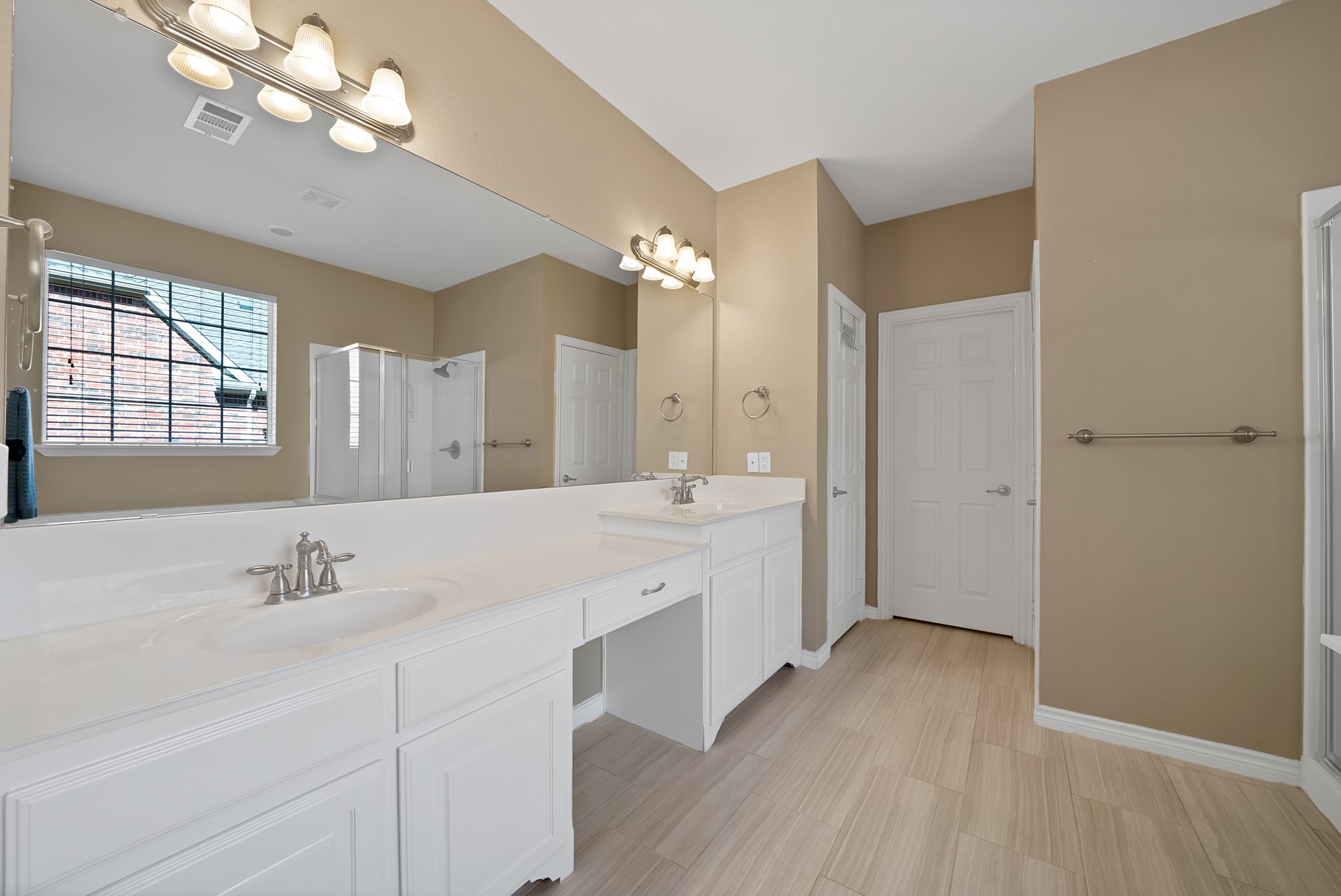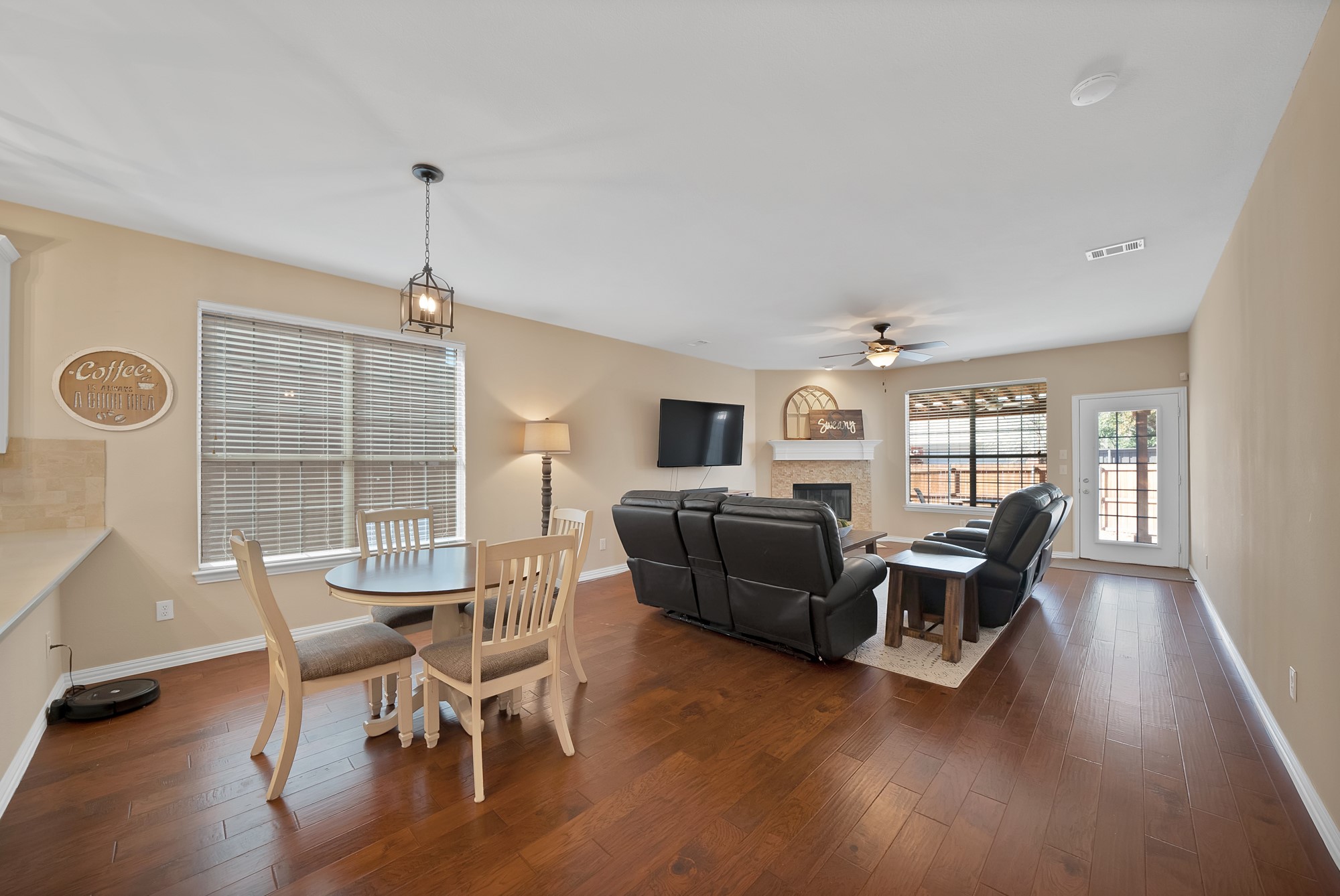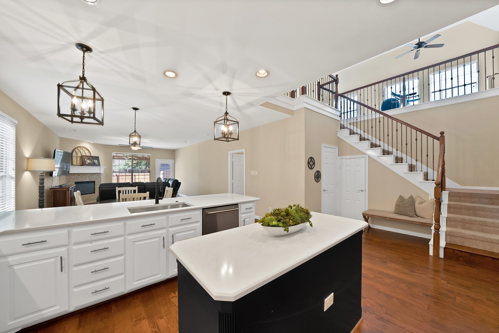 The fully remodeled kitchen is truly stunning and features modern finishes, updated cabinetry, and plenty of space for entertaining. The open layout flows seamlessly into the living area with a gas fireplace, making it perfect for gatherings. Brand new light fixtures throughout the home add a fresh, modern touch.