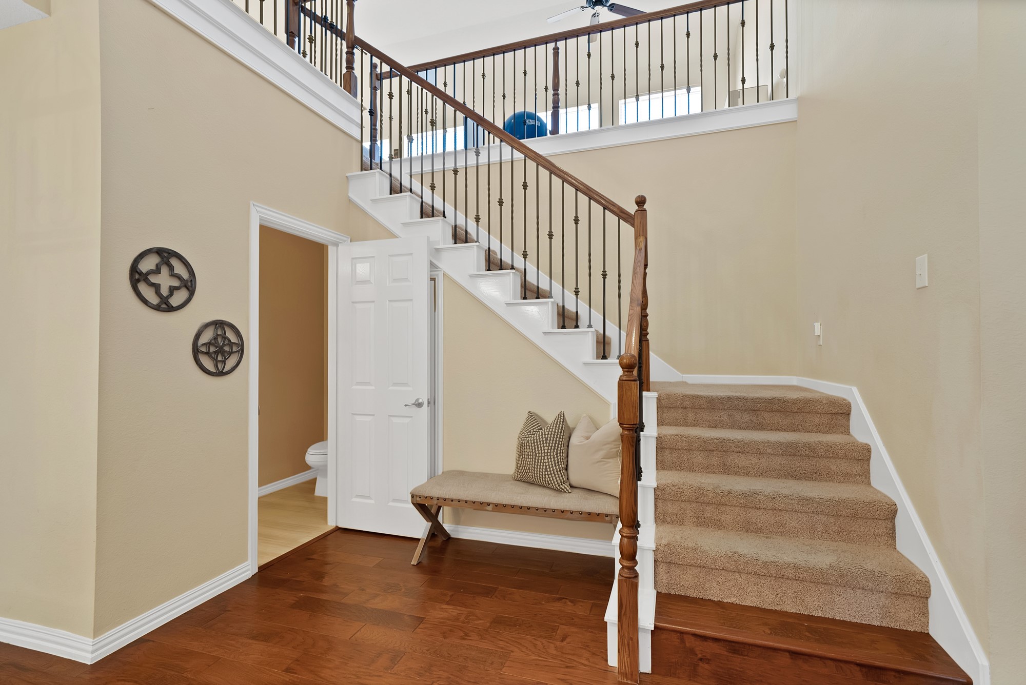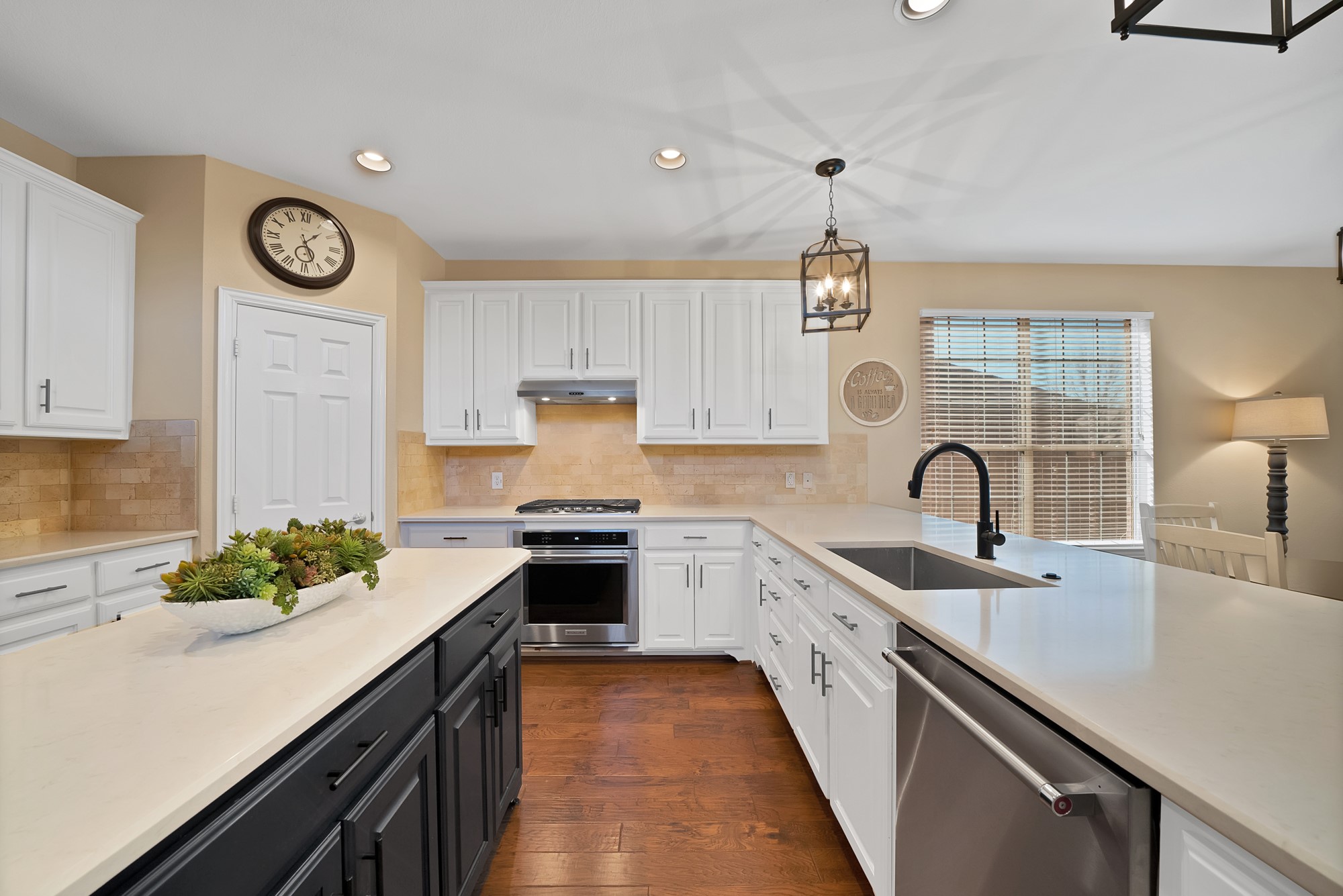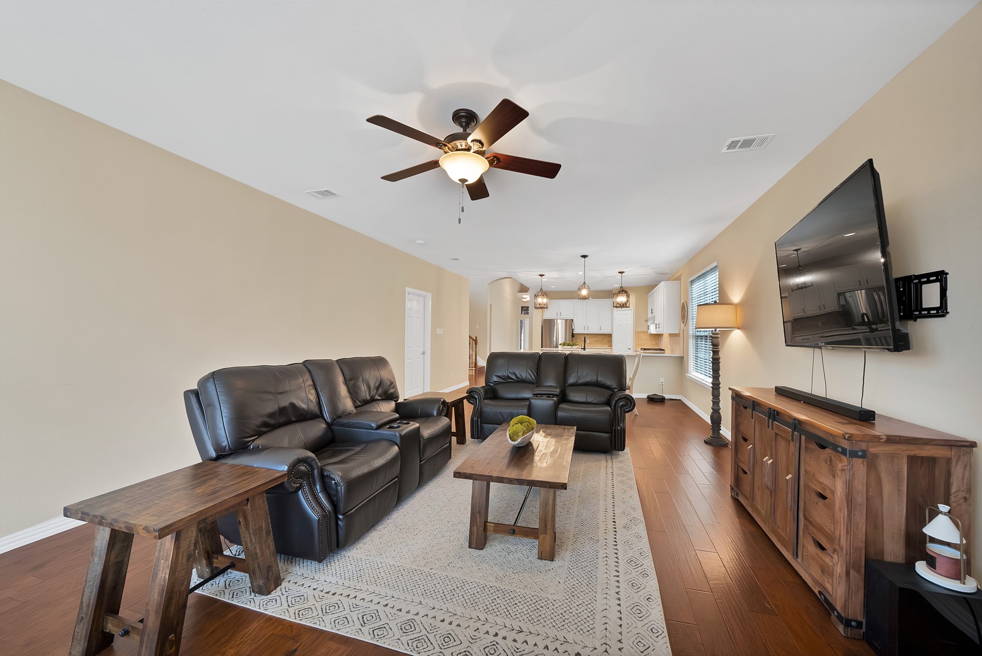 As you enter, you are greeted by soaring ceilings, abundant natural light, and gorgeous engineered wood floors throughout the main living areas. The private primary suite is conveniently located on the first floor along with a home office and formal dining room, creating an ideal setup.